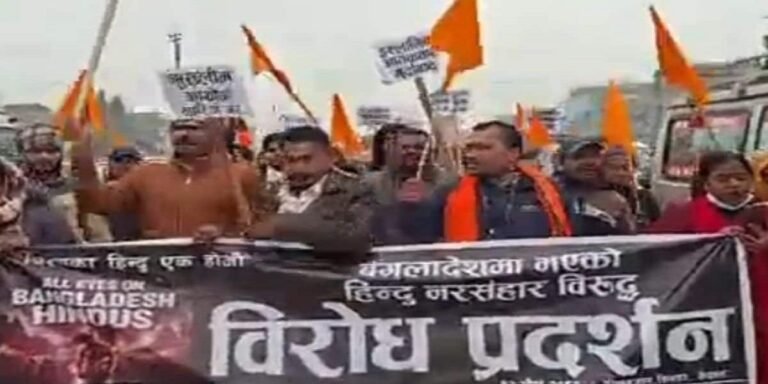 बांग्लादेश में हिंदुओं को निशाना बनाकर की जा रही हिंसा के खिलाफ नेपाल में हिंदू अधिकार समूह राष्ट्रीय एकता अभियान ने सिरहा जिले के गोलबाजार इलाके में विरोध प्रदर्शन किया. गुस्साए प्रदर्शनकारियों ने ईस्ट-वेस्ट हाईवे को ब्लॉक कर दिया जिससे कुछ समय के लिए रास्ता जाम हो गया. प्रदर्शनकारियों ने “हिंदुओं की हत्या बंद करो” “अल्पसंख्यकों की सुरक्षा पक्की करो” और “मानवाधिकार का सम्मान करो” जैसे नारे लगाए. विरोध प्रदर्शन का नेतृत्व करते हुए सिरहा में राष्ट्रीय एकता अभियान के जिला अध्यक्ष हेमंत सिंह ने कहा कि हम शांतिपूर्ण प्रदर्शन के जरिए बांग्लादेश सरकार पर अल्पसंख्यकों की जिंदगी और सुरक्षा की गारंटी के लिए दबाव डालना चाहते हैं. जब तक ऐसी घटनाएं खत्म नहीं हो जातीं, हमारा संघर्ष जारी रहेगा.